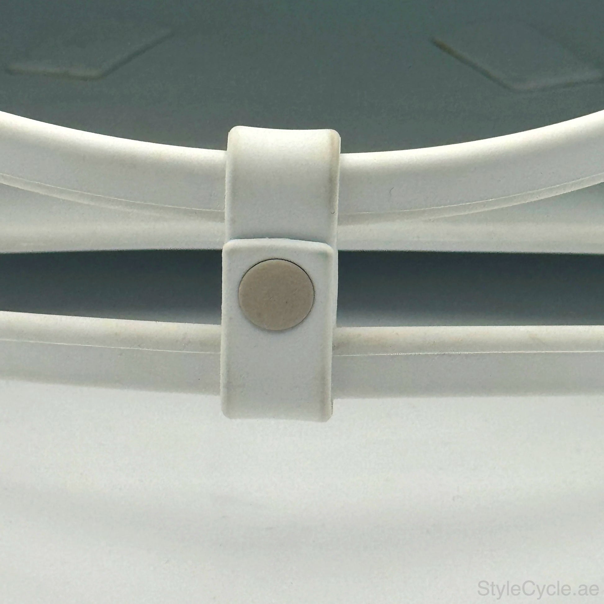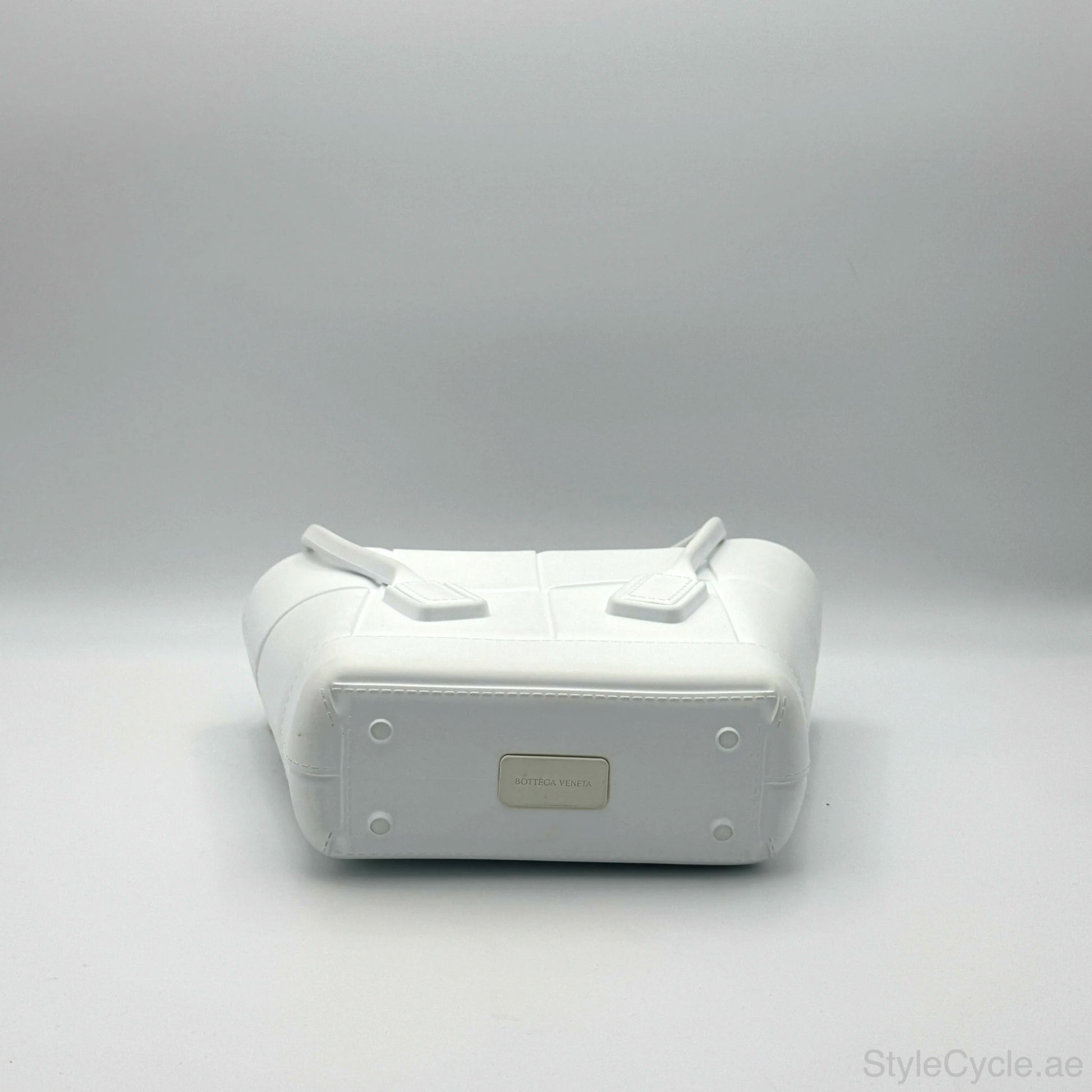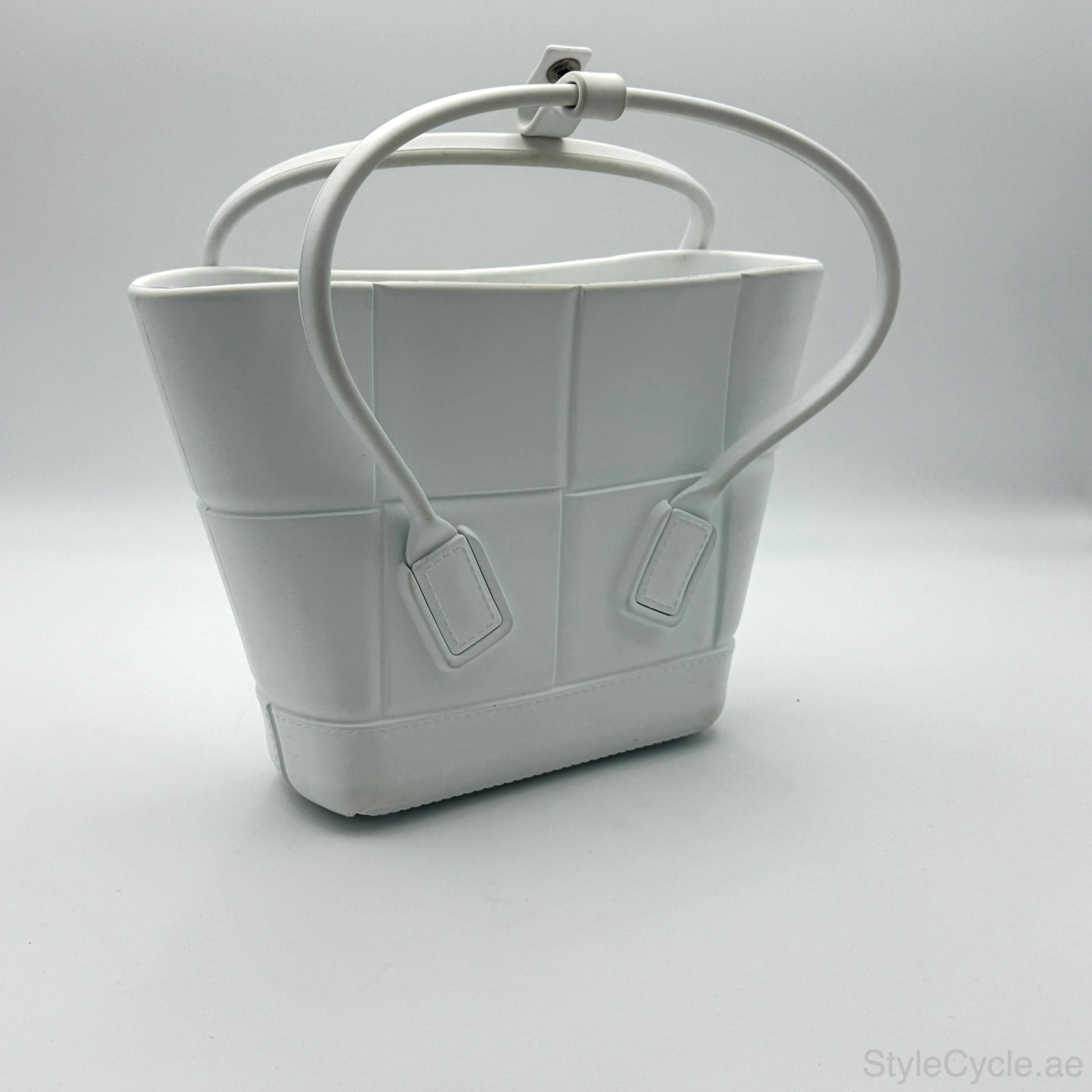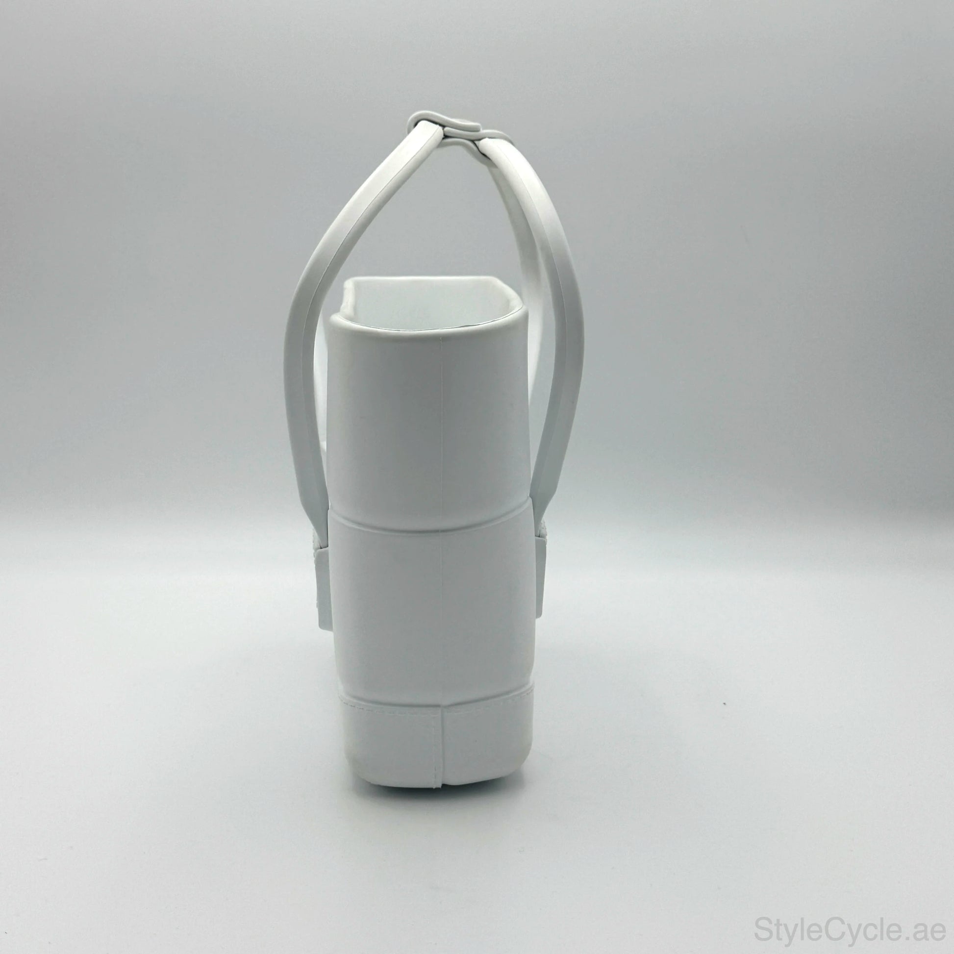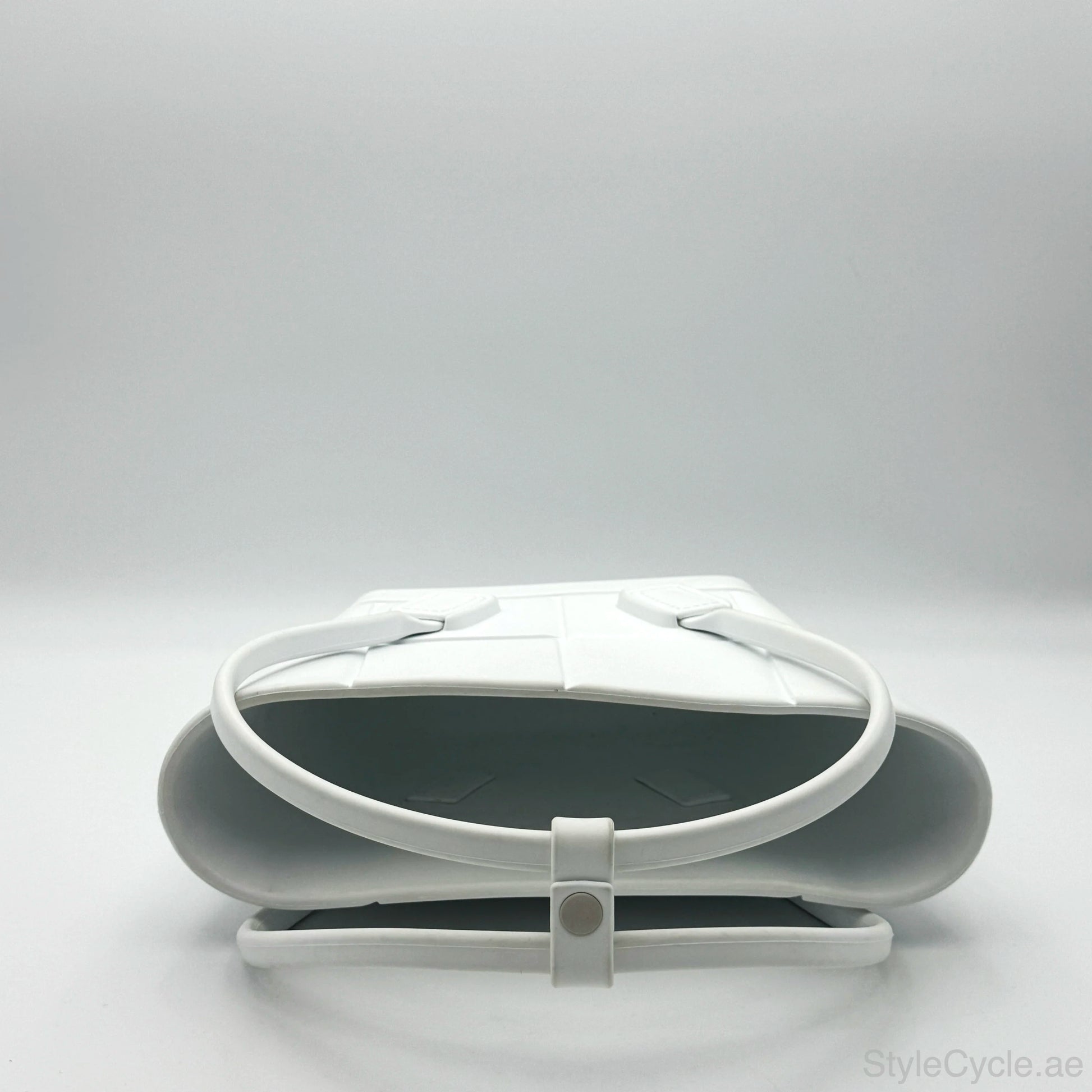A bold reinterpretation of a classic, the Arco Tote in rubber is Bottega Veneta at its most playful and progressive. Crafted from sleek, matte white rubber and molded into the brand’s signature Intrecciato weave, this statement piece turns functional design into wearable art.