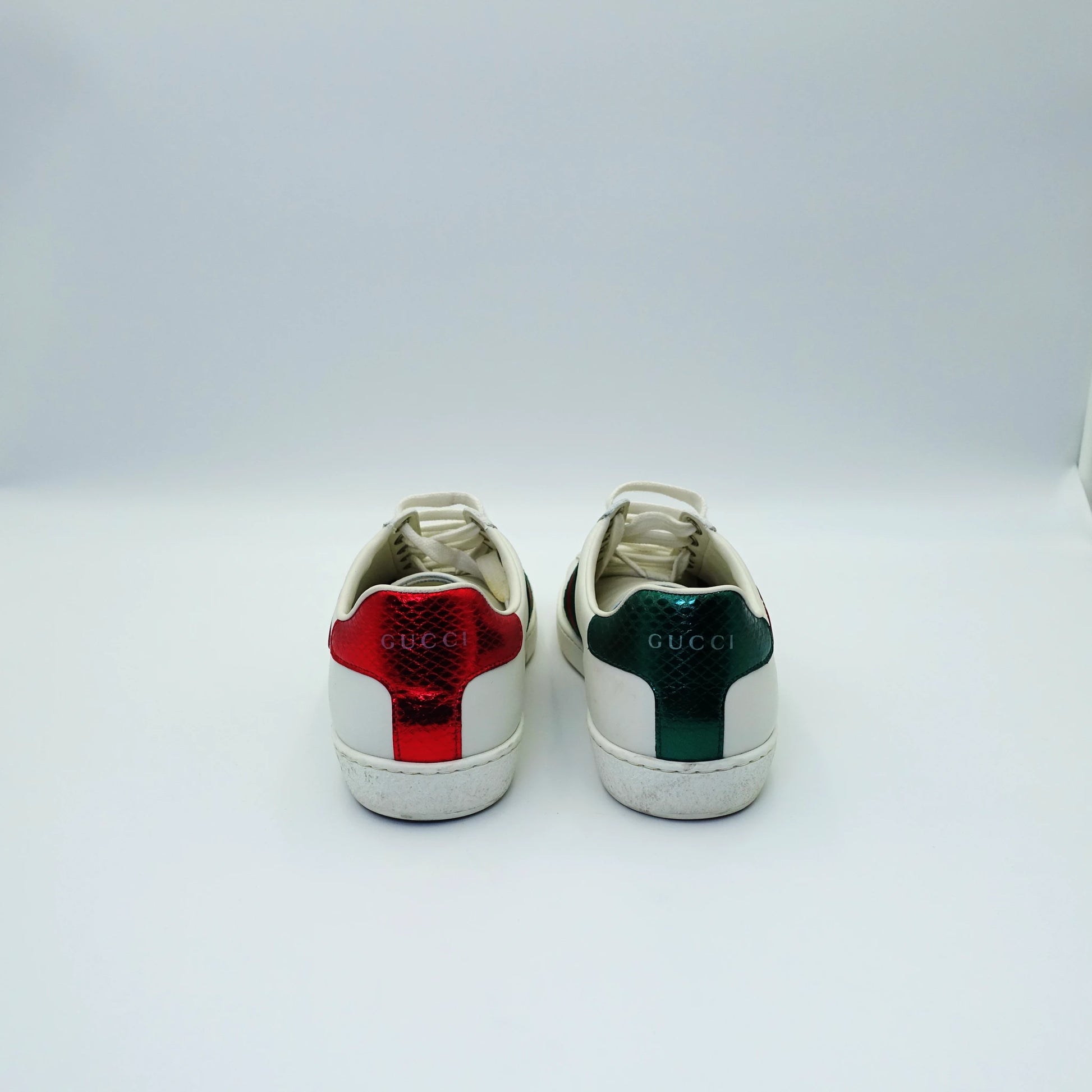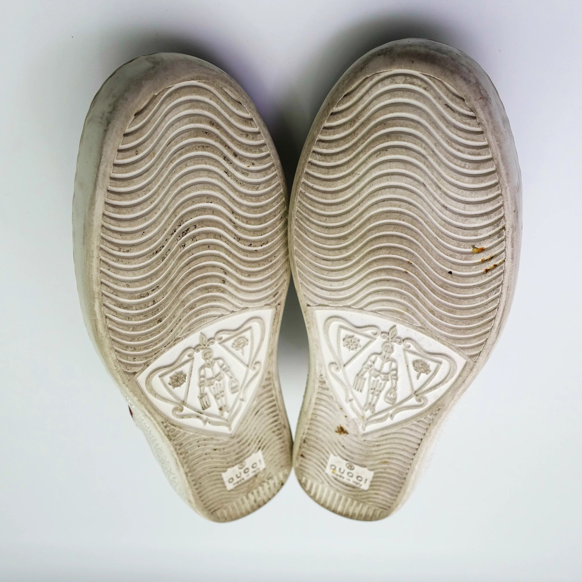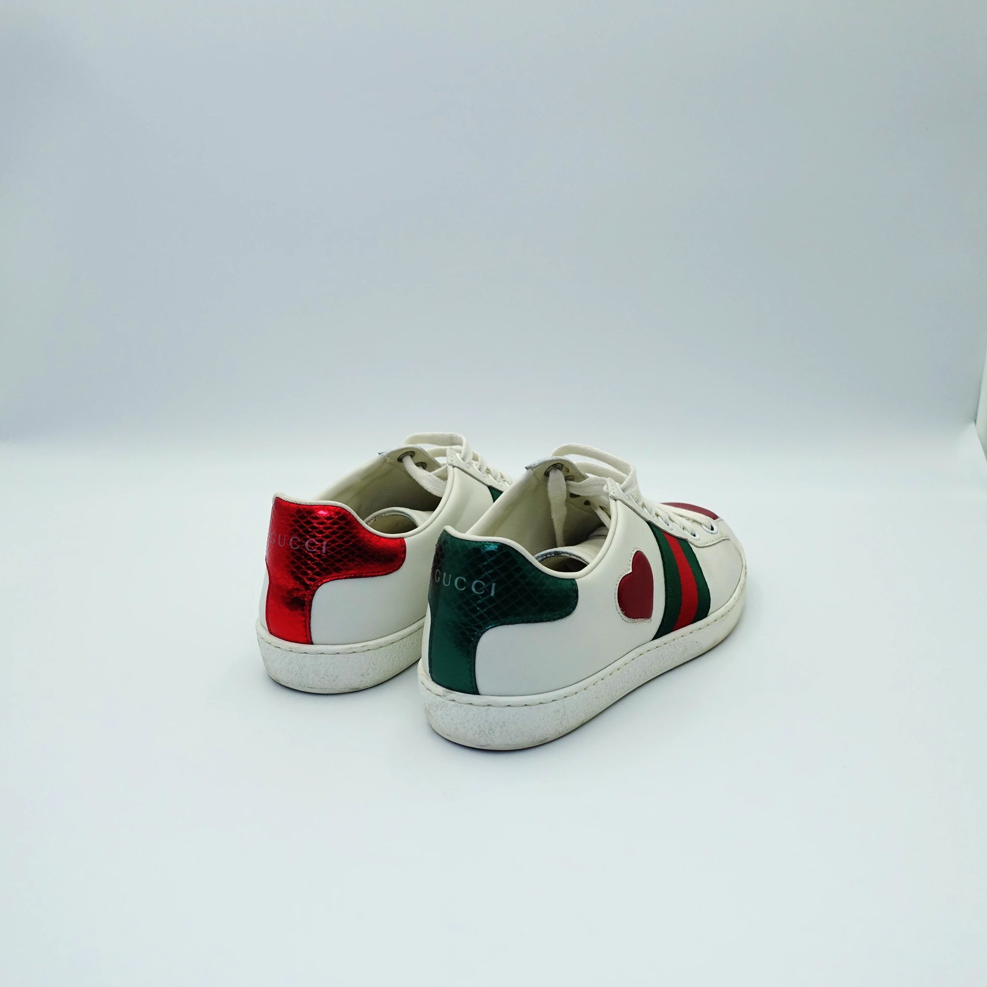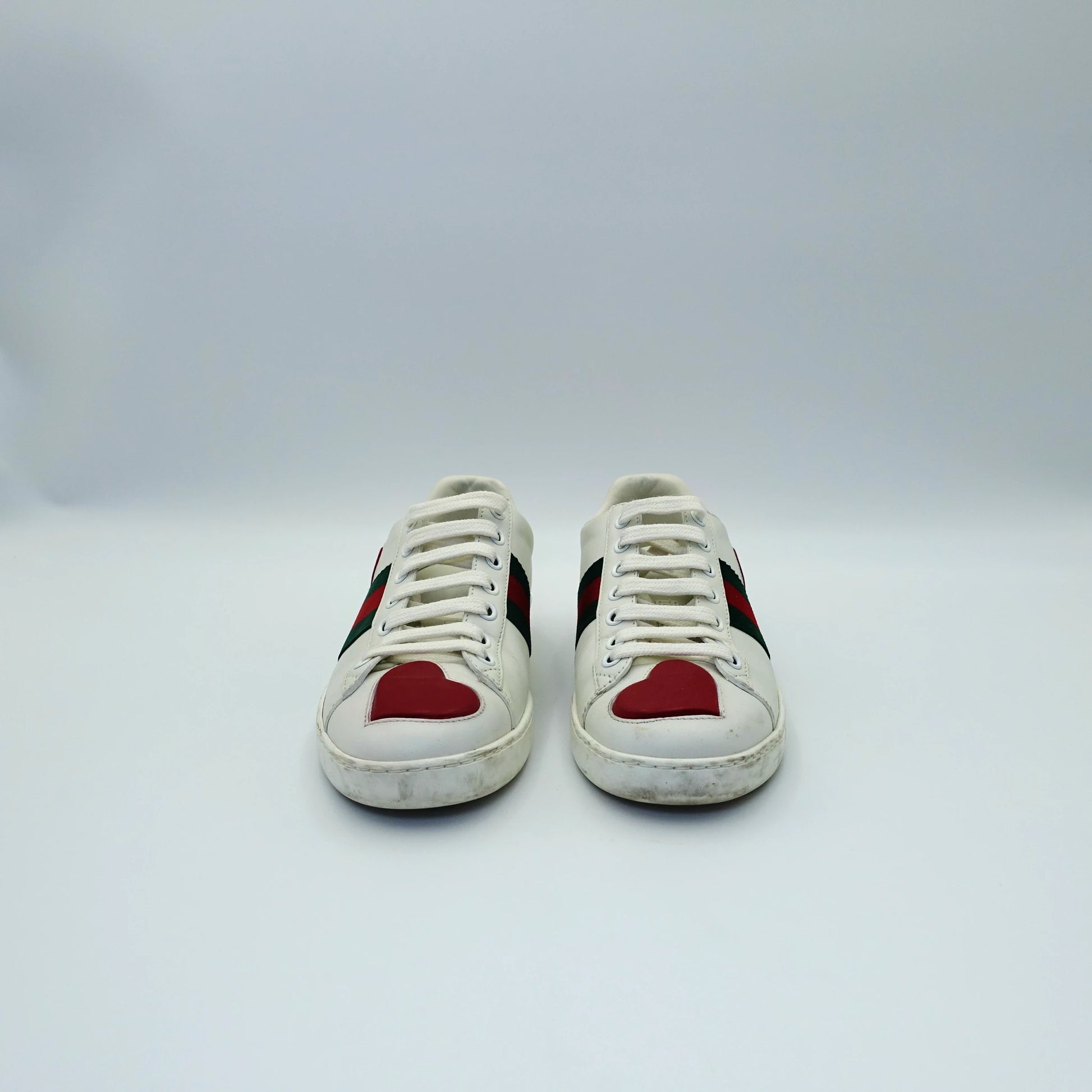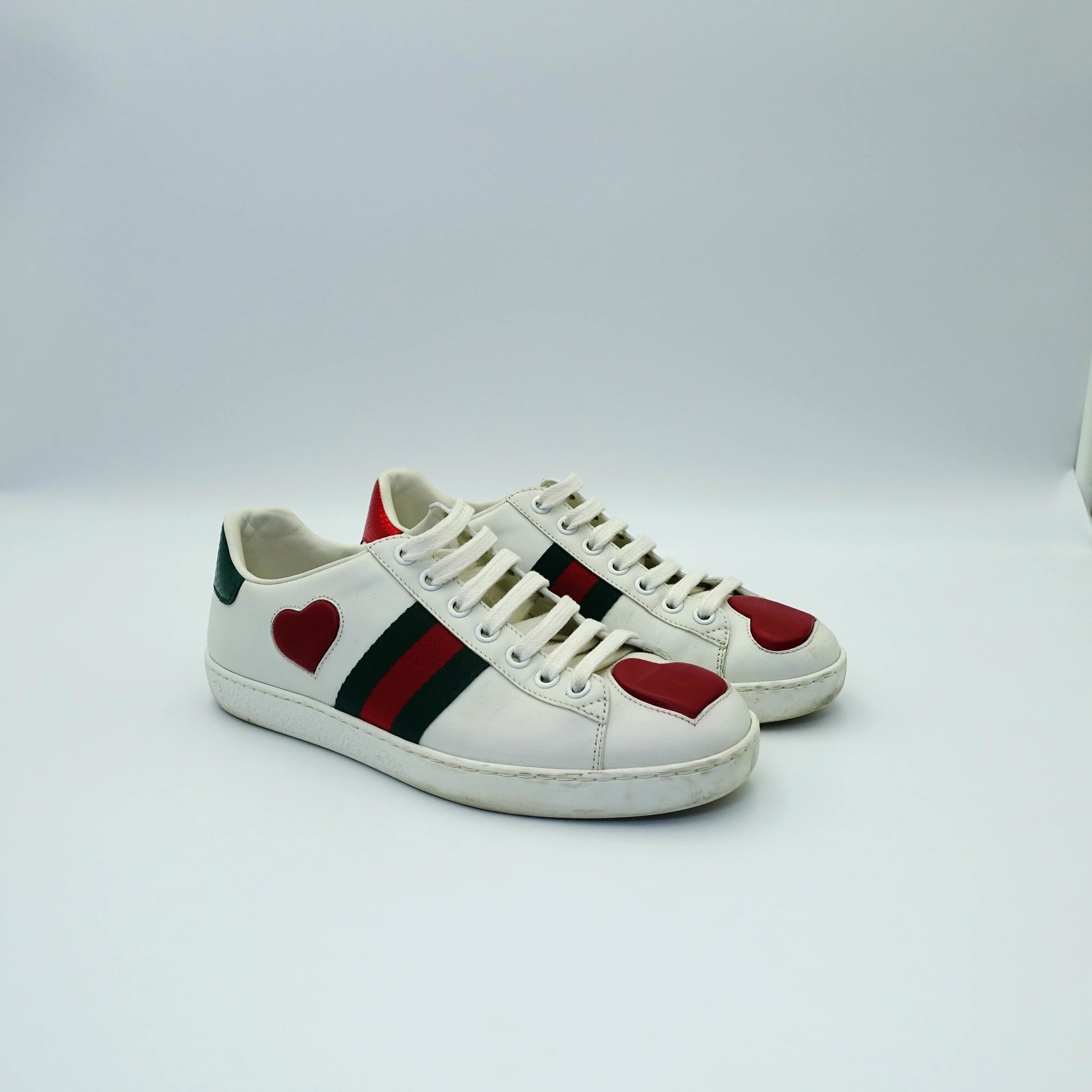 Gucci’s cult-favourite Ace sneakers get a romantic twist with the red heart appliqué at the side. Crafted in smooth white leather, the low-top silhouette features the house’s iconic green and red web stripe, paired with contrasting metallic heel tabs. A playful yet timeless design, these sneakers combine everyday comfort with unmistakable Gucci charm — the perfect mix of casual luxury and statement style.