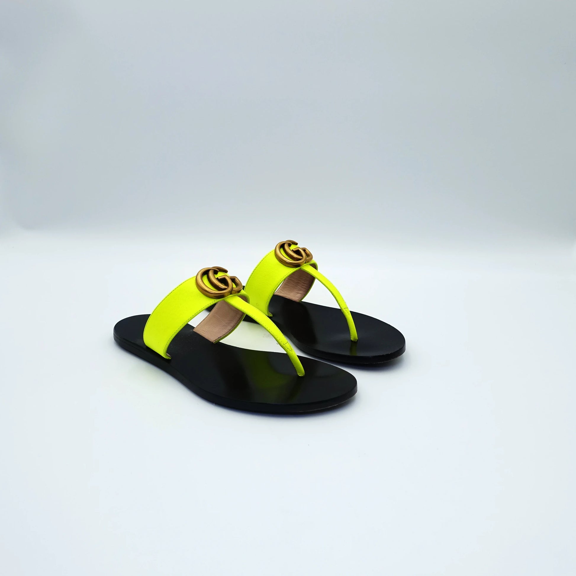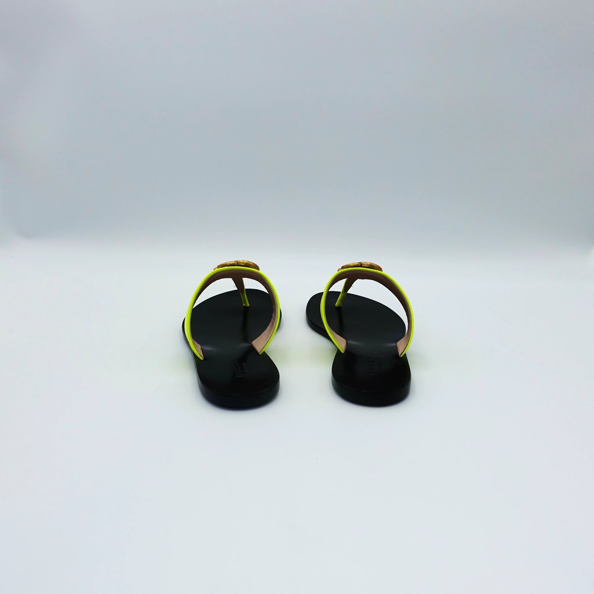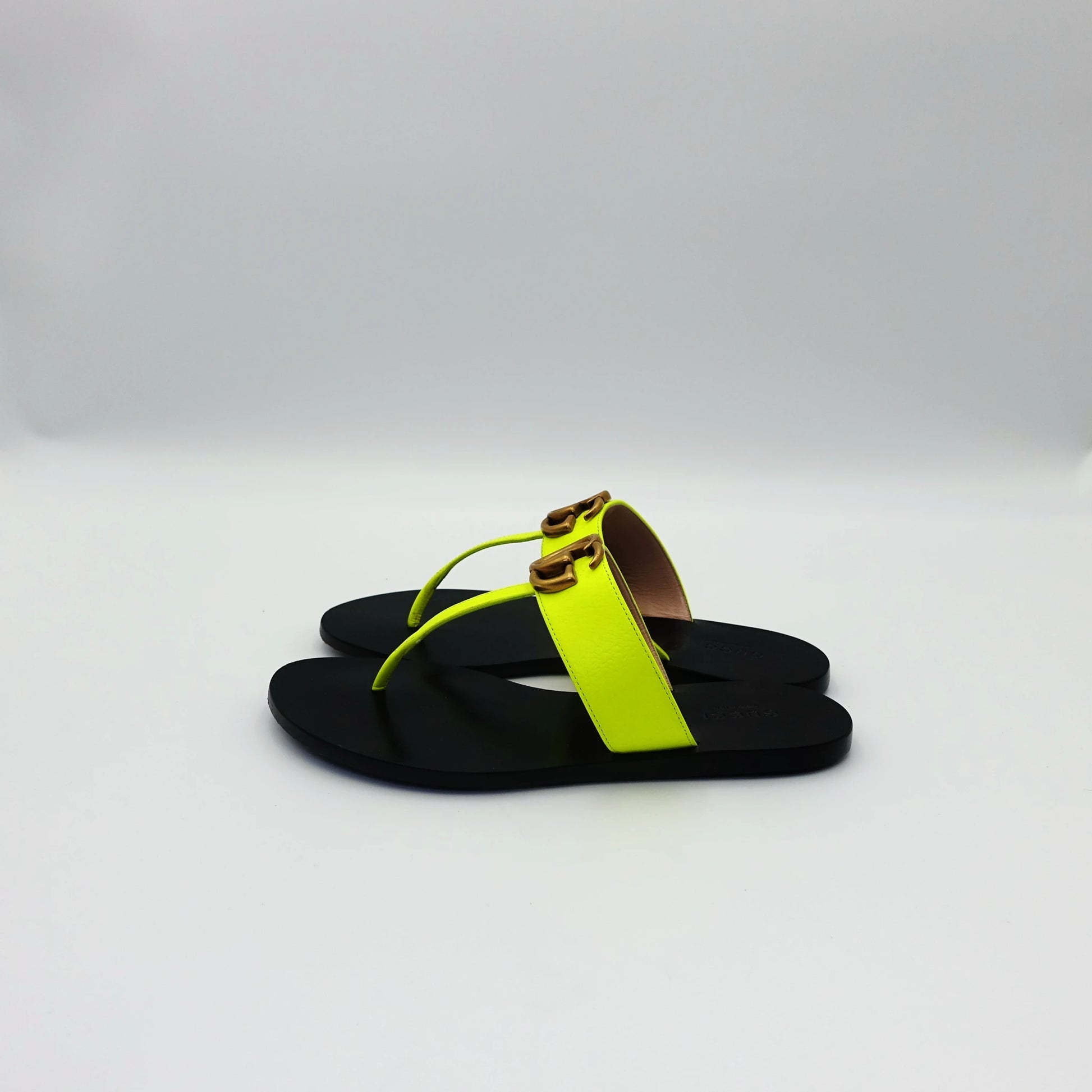 Turn heads with these vibrant Gucci neon yellow slip-on sandals, crafted in smooth fluorescent leather and finished with the house’s signature interlocking GG hardware in gold-tone metal. Featuring a sleek black sole and minimalist thong silhouette, they bring a bold pop of colour to any summer wardrobe. Perfect for resort escapes, city strolls, or adding statement flair to casual looks.