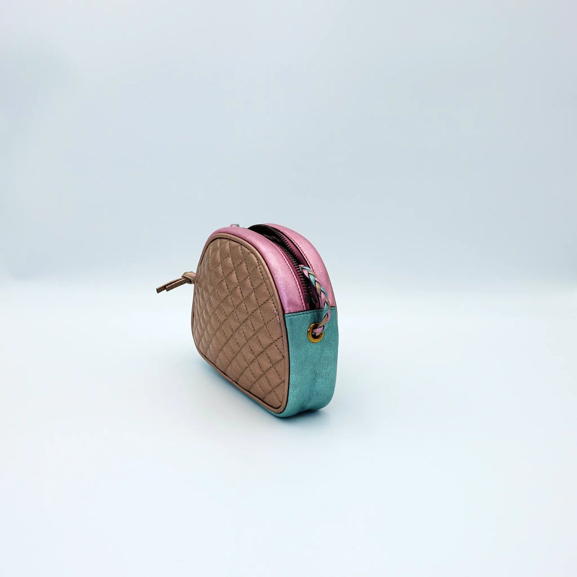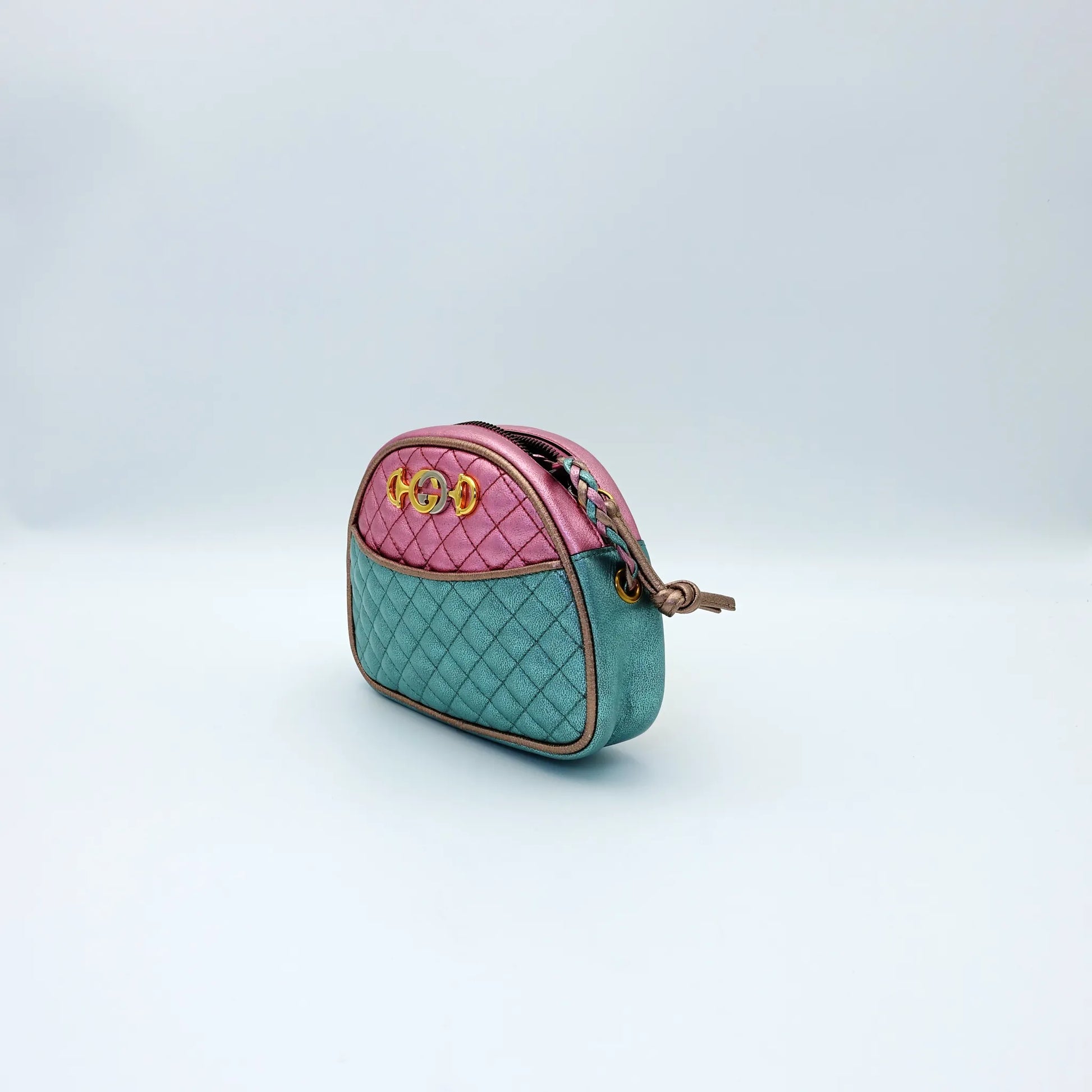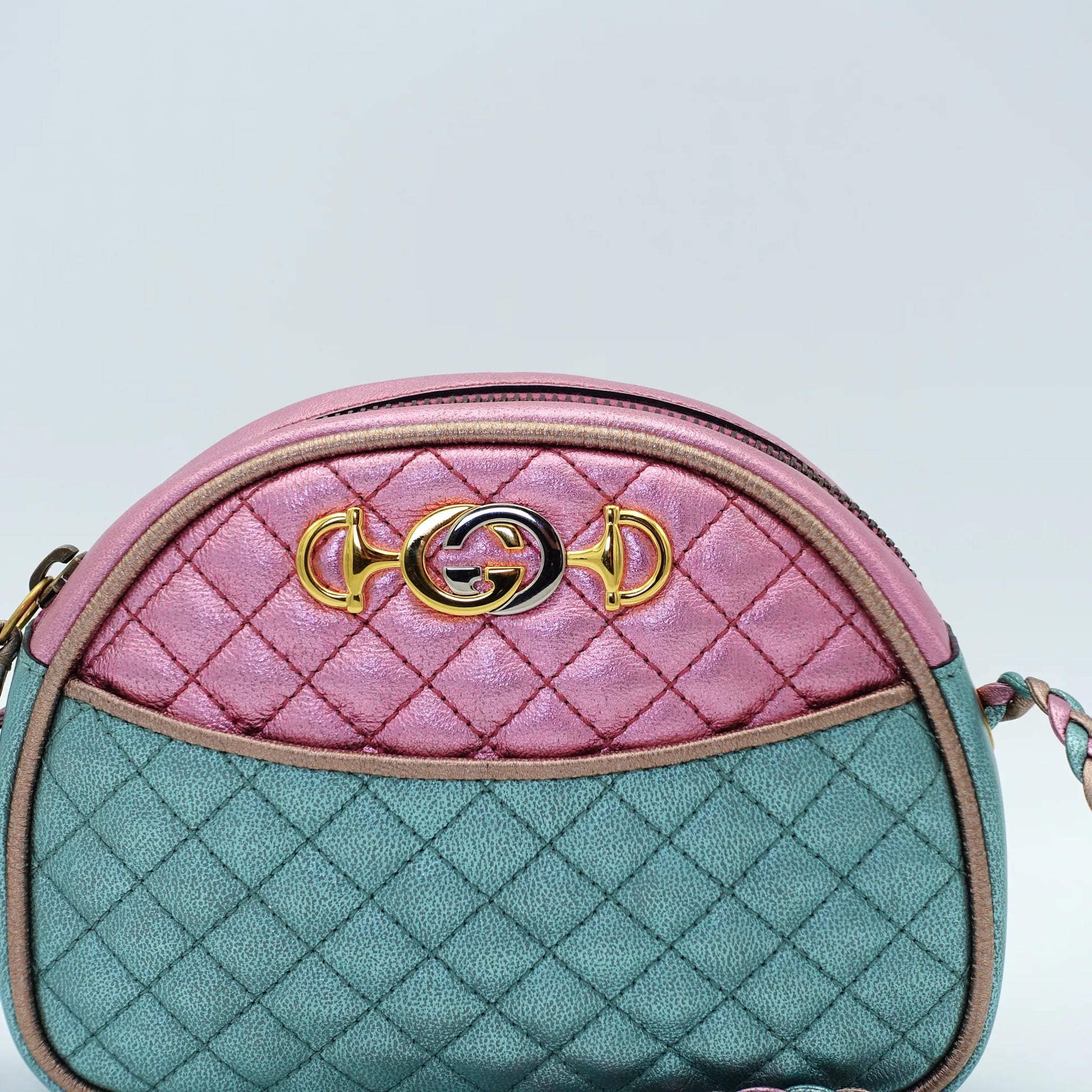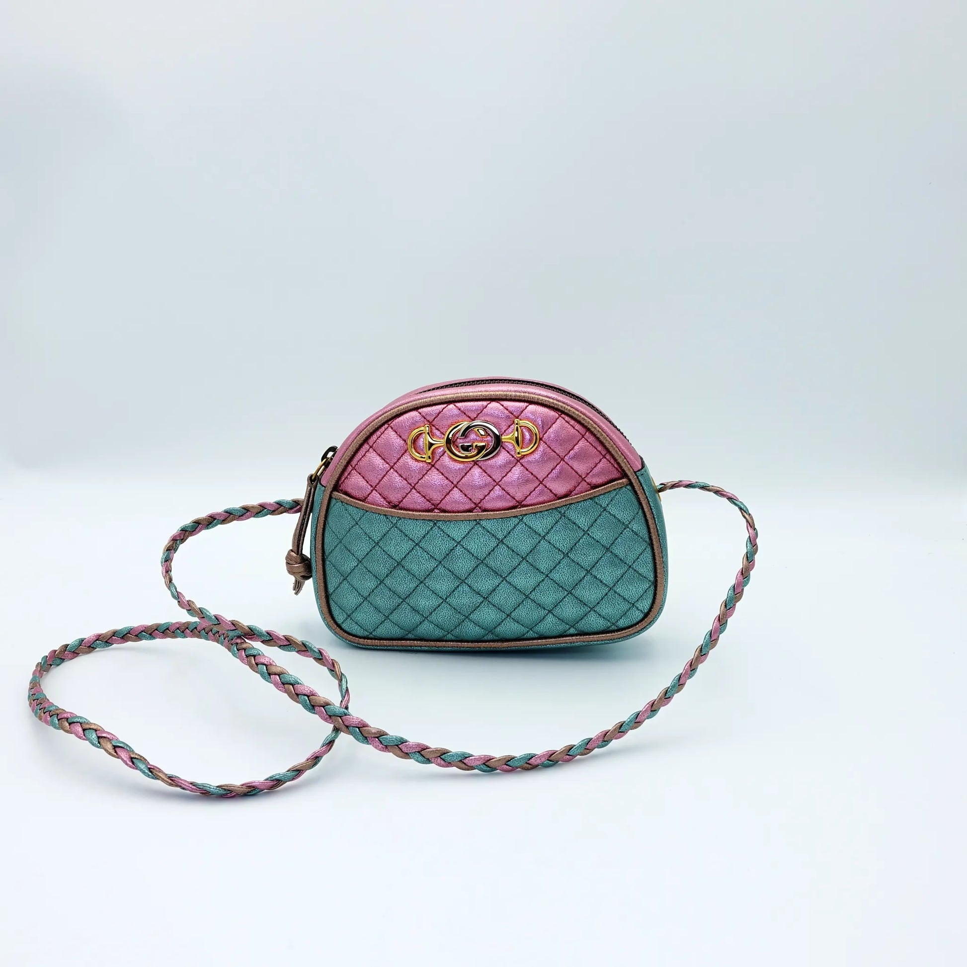 This striking Gucci Ophidia GG Marmont Dome Crossbody Bag showcases the maison’s playful take on luxury with a rare metallic quilted finish in pink and teal leather. Adorned with the signature interlocking GG logo in gold and silver-tone hardware, it features a rounded dome silhouette and a braided leather crossbody strap interwoven with metallic tones. Compact yet practical, this bag is perfect for adding a statement touch to both day and evening looks. A collectible piece for Gucci enthusiasts, reflecting Alessandro Michele’s bold, eclectic vision.