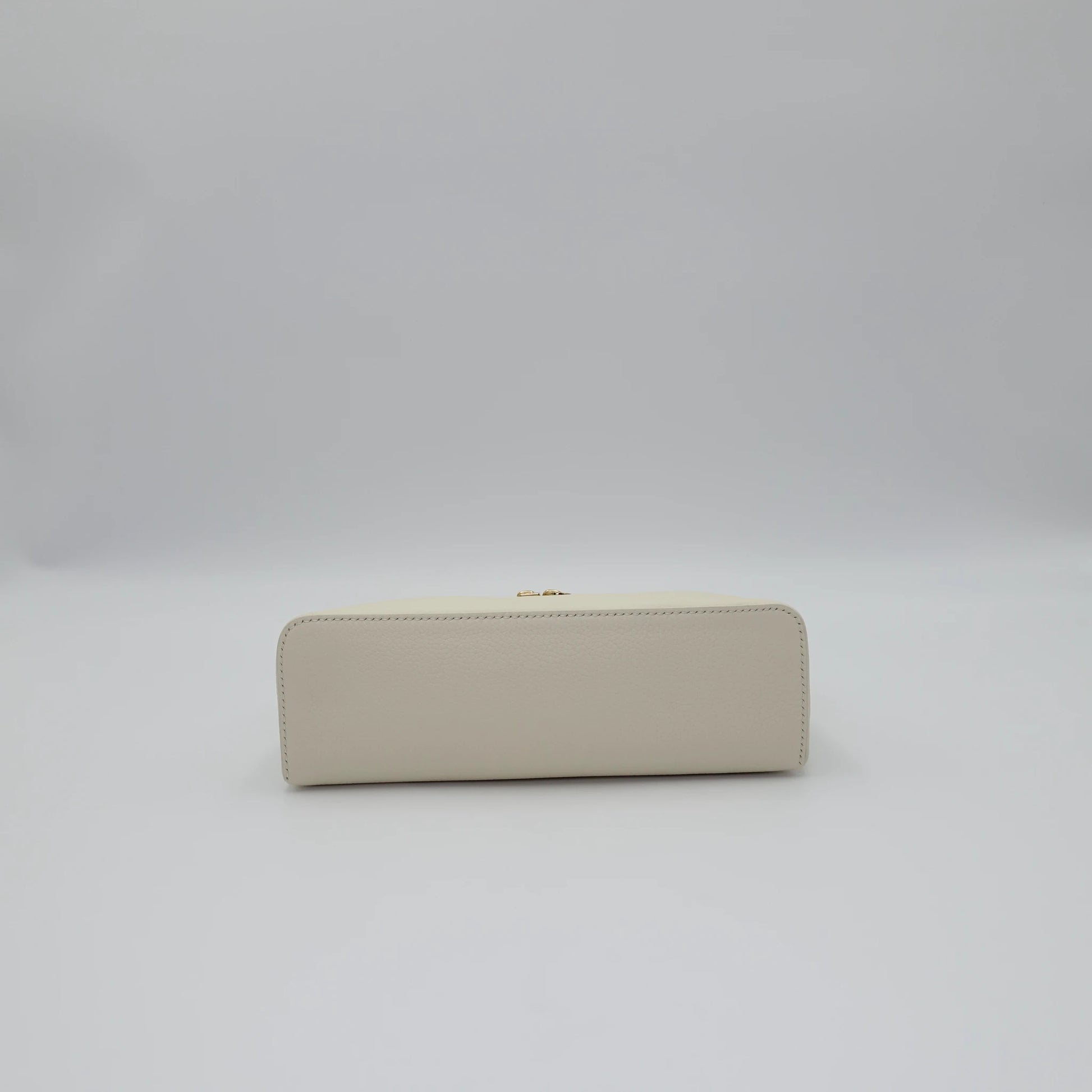 The Extra Pocket 19 is one of Loro Piana’s most coveted and hard-to-find designs. This compact yet versatile bag embodies the house’s philosophy of quiet luxury and refined craftsmanship. Presented here in the Whispering White shade — a rare and sold-out colorway that has become highly sought after by collectors — the piece features smooth calfskin leather, a gold tone zip-around closure with signature LP hardware, a discreet top handle and a removable strap for extra versatility. Its understated elegance makes it ideal for use as a chic vanity case, travel companion, or minimalist clutch, cementing its reputation as one of Loro Piana’s most collectible accessories.
