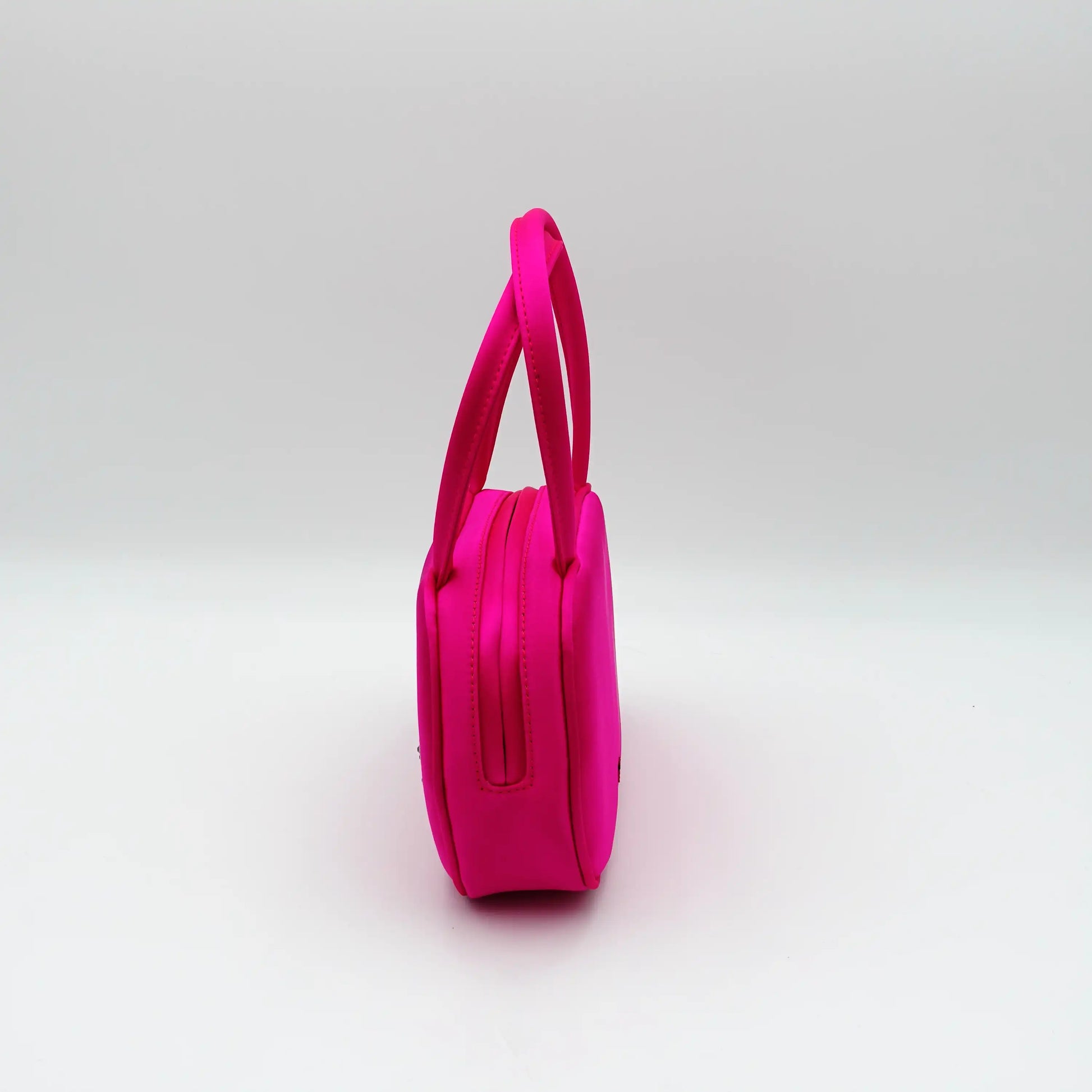 Step into high-impact glamour with the Amina Muaddi Small Ciao Bella Bag in hot pink satin. Designed for the modern fashionista, this designer mini handbag features the iconic Ciao Bella crystal logo, making it a standout statement party bag. The bold hot pink satin exterior captures the brand’s playful spirit, while the compact structure keeps it practical for evening essentials.