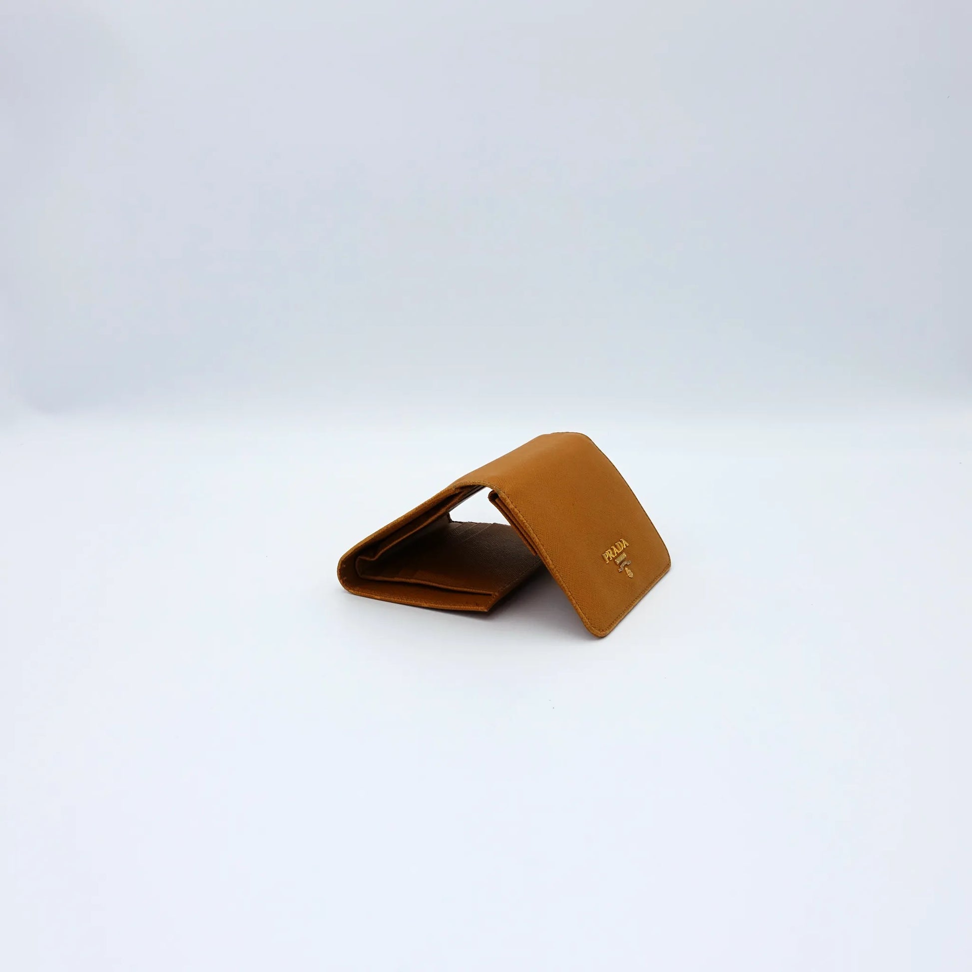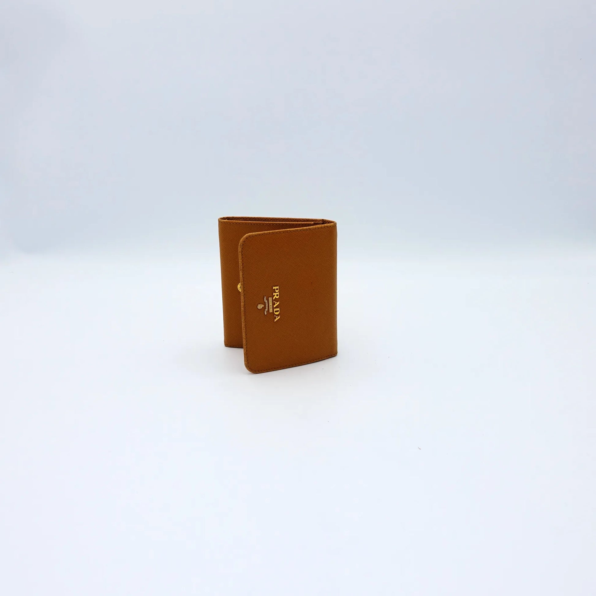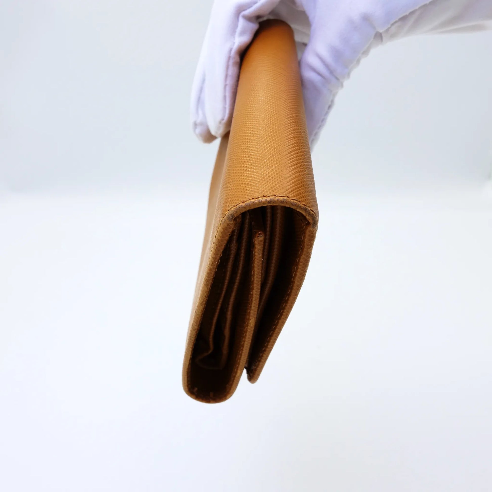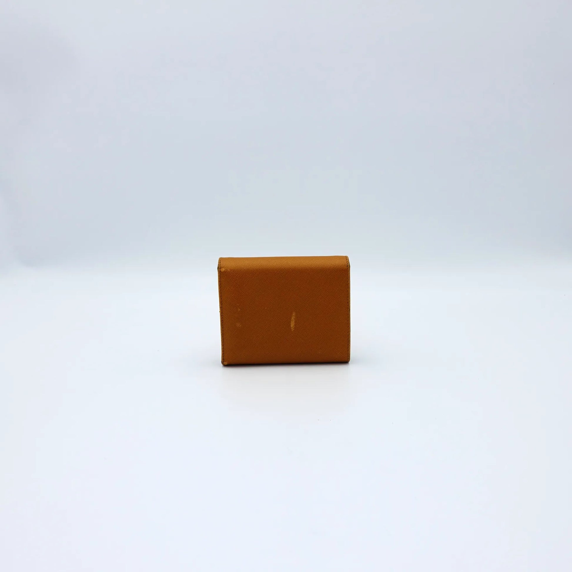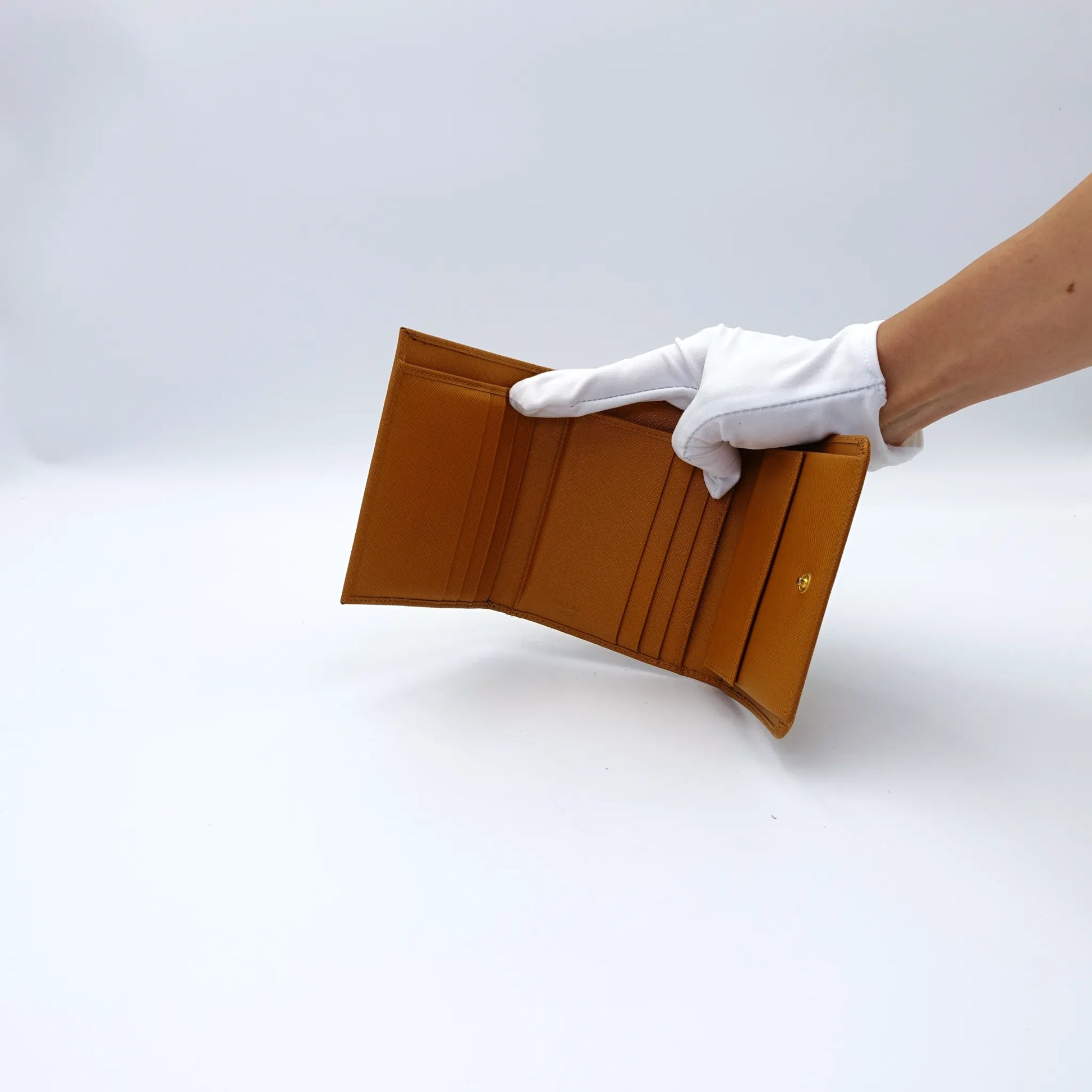 Crafted in Prada’s signature Saffiano leather, this classic tri-fold wallet is presented in a rich mustard yellow hue with gold-tone logo hardware. Designed for practicality, it opens to a well-organized interior featuring multiple card slots, a bill compartment, and a coin pocket. Compact yet structured, it embodies Prada’s timeless approach to everyday luxury. With its warm tone and functional design, this piece is a versatile staple for any handbag.
