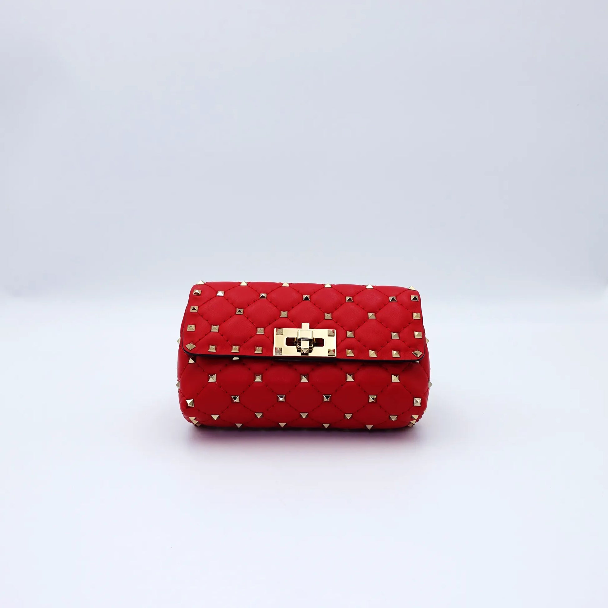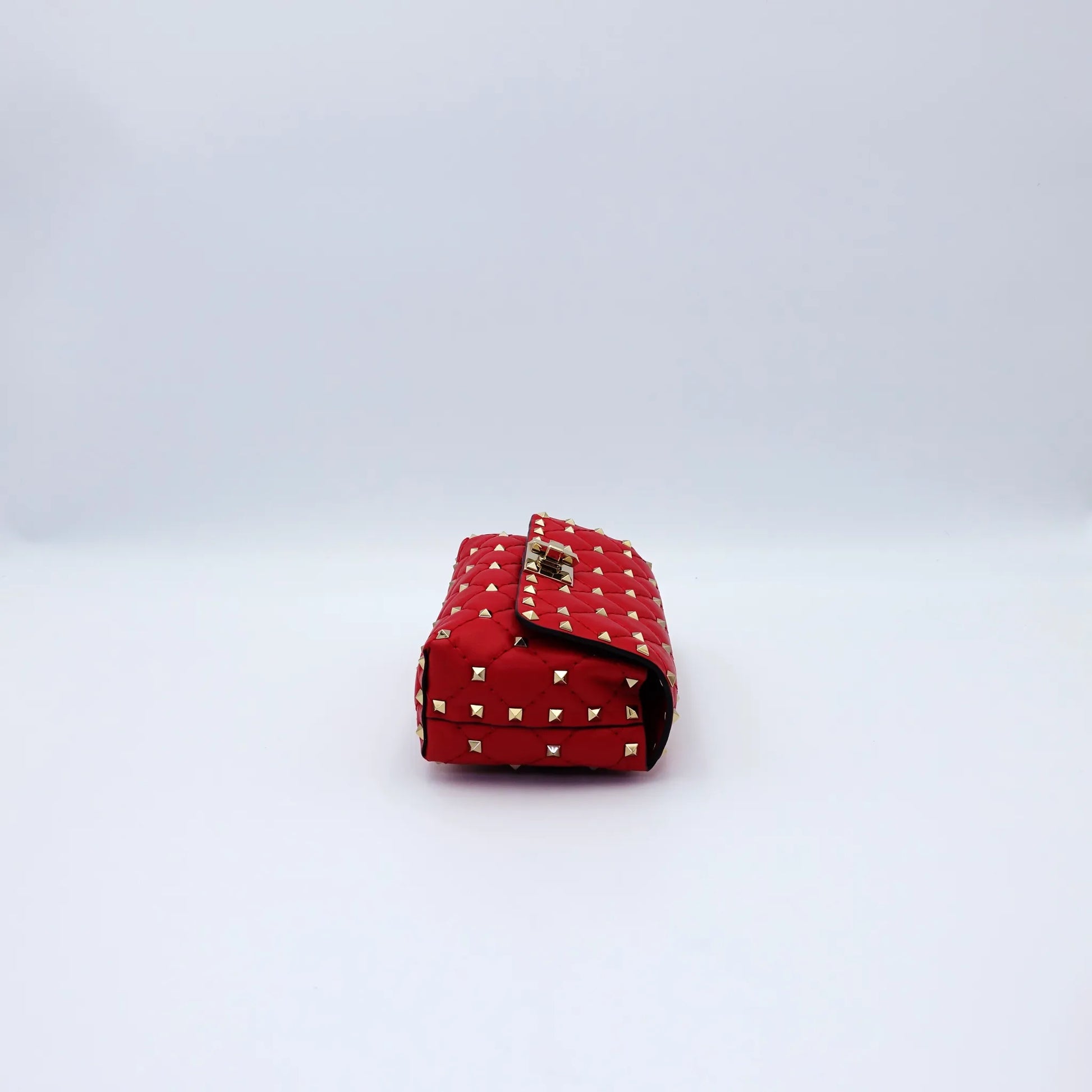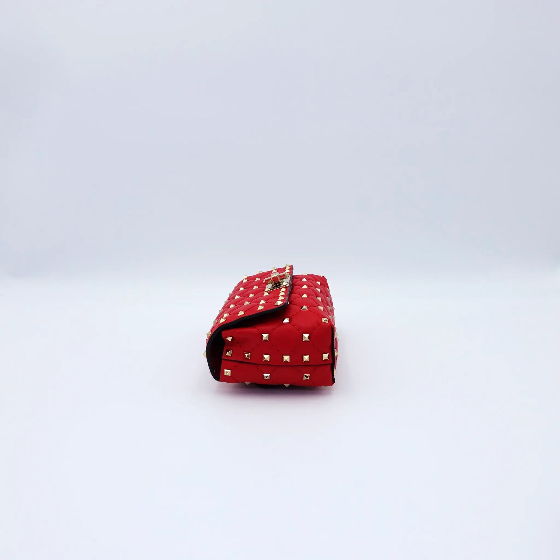 Crafted in supple red quilted nappa leather and accented with signature Valentino Rockstud embellishments in gold-tone hardware, this Valentino Garavani Spike Waist Bag combines edgy glamour with everyday practicality. Designed with a flap closure and secure twist-lock, it opens to a compact interior ideal for essentials. The detachable belt strap allows versatile styling — worn as a waist bag, crossbody, or carried as a chic clutch. A playful yet sophisticated statement piece for day-to-evening wear.